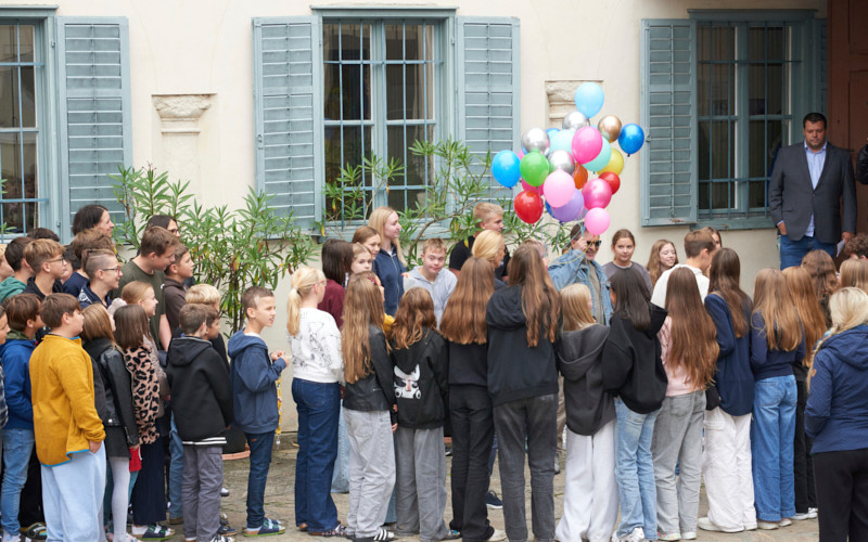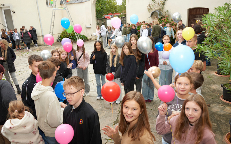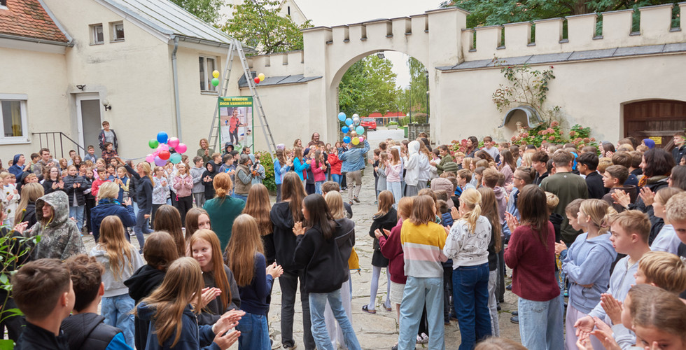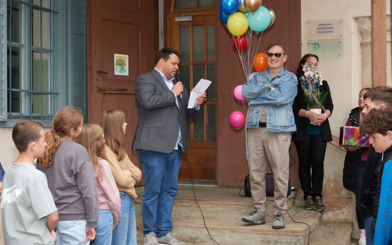 Trotz der kühlen Temperaturen standen alle Schüler:innen sowie Lehrpersonen am 30. September 2025 im Schlosshof bereit, um mit bunten Ballons und einem würdigen Song gewappnet, unsere beiden Ehrengäste zu empfangen. Die Überraschung war groß und beide staunten nicht schlecht, als sich die ersten Lehrpersonen mit Mikrofon für eine Rede positionierten. Es wurden in dieser Stunde viele Reden gehalten, sei es nun vom Kollegium des Fachteams, des Vernetzten Unterrichts oder aus der Sport- und Kunstszene. Diese rührenden Ansprachen waren eine herzerwärmende Möglichkeit, zumindest annähernd in Worte fassen zu können, was für eine wichtige Rolle diese beiden Menschen für die PMS Dobl spielen. Beide bestritten den Dobler Weg für Jahrzehnte, haben ihn mitaufgebaut, Stein für Stein. Sie haben viele schöne Spaziergänge darauf erlebt, aber auch Unebenheiten und Veränderungen. Die beiden haben viele Menschen auf diesem Weg begleitet und inspiriert.