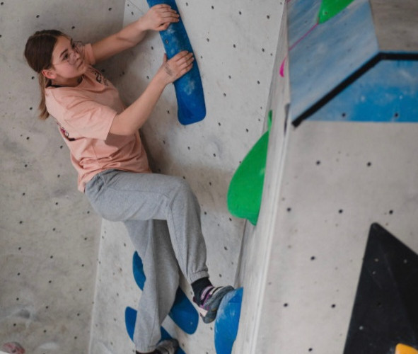 Bouldern: Damit ist das Klettern ohne Seil bzw. Klettergurt gemeint. Hier präsentierte uns Isabel aus der 3D einige Übungen. Sie klettert auch in ihrer Freizeit im Boulderclub Graz und zeigte vor, wie leicht man scheinbar schwierige Routen durchklettern kann.