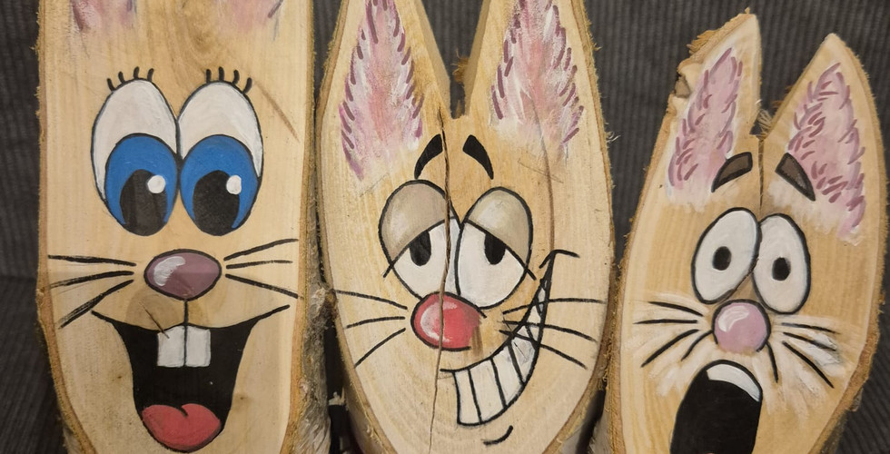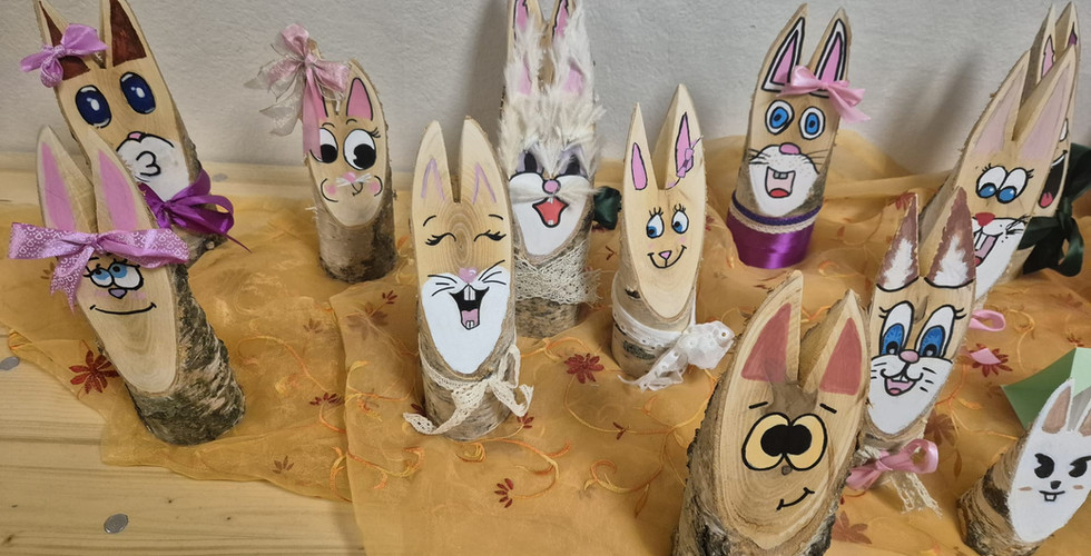 Auch dieses Jahr zierten entzückende, süße und lustige Birkenholz-Osterhasen von den KREA-Gruppen unsere Schule.