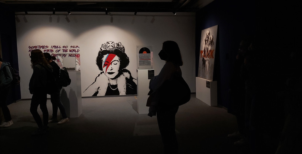 Die mit dem Abflauen der Pandemie einher gehenden Öffnungsschritte erlauben nunmehr auch wieder Lehrausgänge und Exkursionen. So wurde ein Nachmittag am 26. April dafür genutzt, um mit den Schülerinnen und Schülern der dritten und vierten Klassen des Wahlpflichtfaches Kreatives Gestalten die Schau des weltberühmten britischen Streetart-Superstars Banksy zu besuchen. Zur Vorbereitung waren in vorangegangenen Unterrichtseinheiten eigene Versuche gestartet worden, mittels Schablonentechnik Graffitis in „Banksy-Manier“ zu gestalten und Wissenswertes über das Kunst- und Vermarktungsgenie in Erfahrung zu bringen.